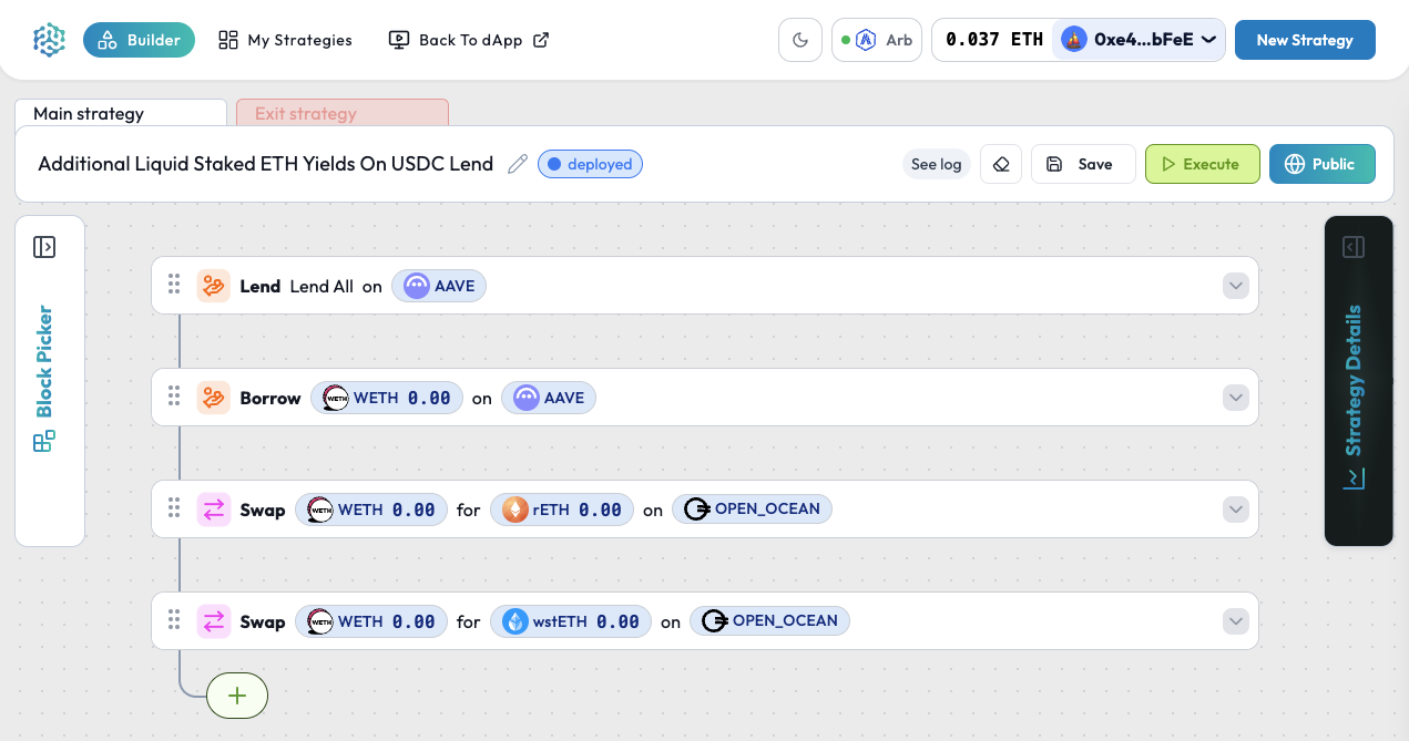 This strategy earns USDC lending interest on Aave and borrows ETH to generate additional ETH liquid staking yields.