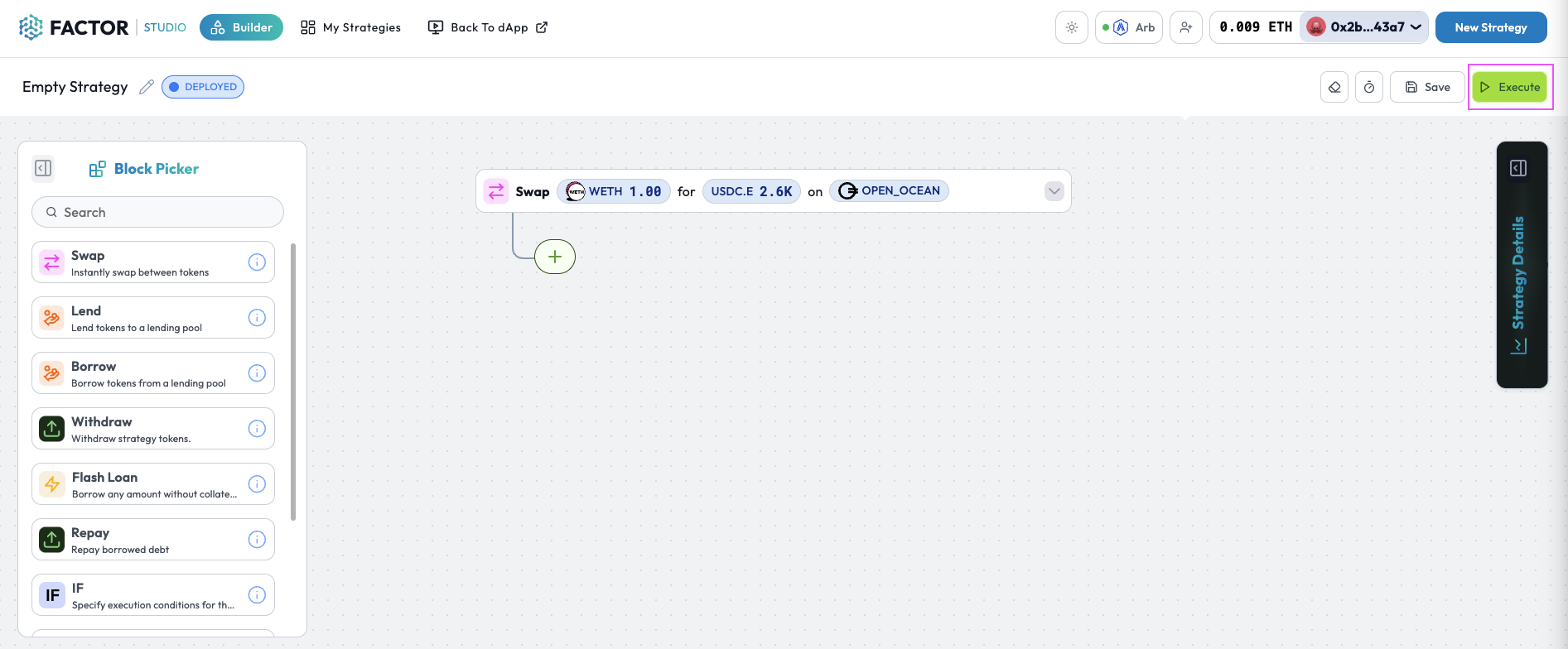 Once all the tests have passed and you are happy with your strategy, you can execute your strategy with a single click in the top right.