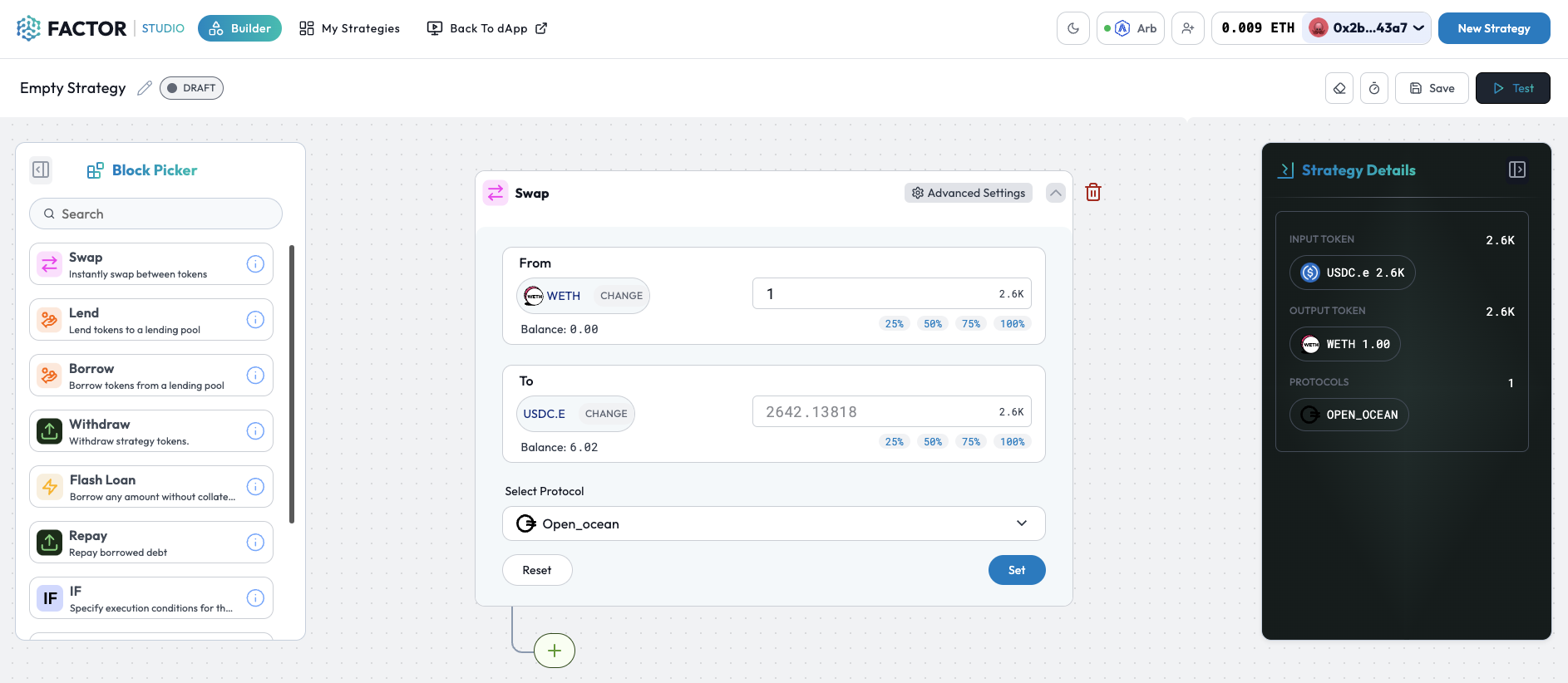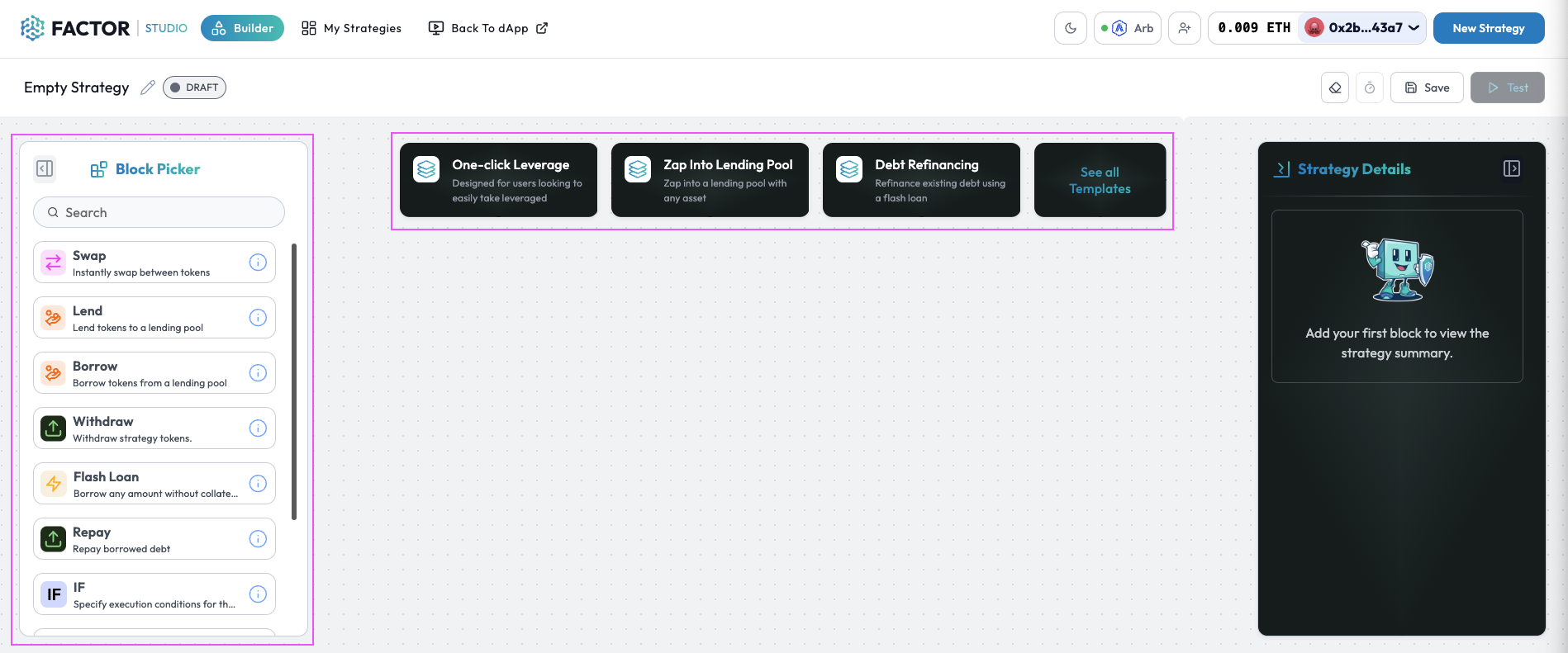 * **Building Blocks:** Select various DeFi building blocks from the Block Picker to add them to the canvas.
