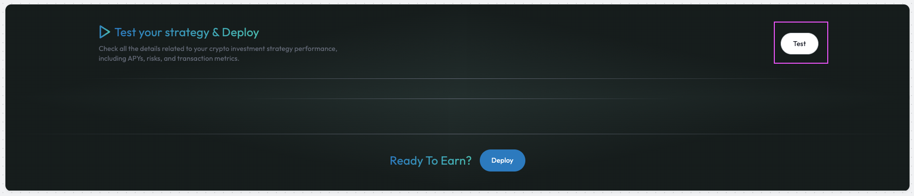 To ensure your strategy executes as intended, you can test your strategy. This will simulate the execution of your strategy and provide you with the corresponding results.
