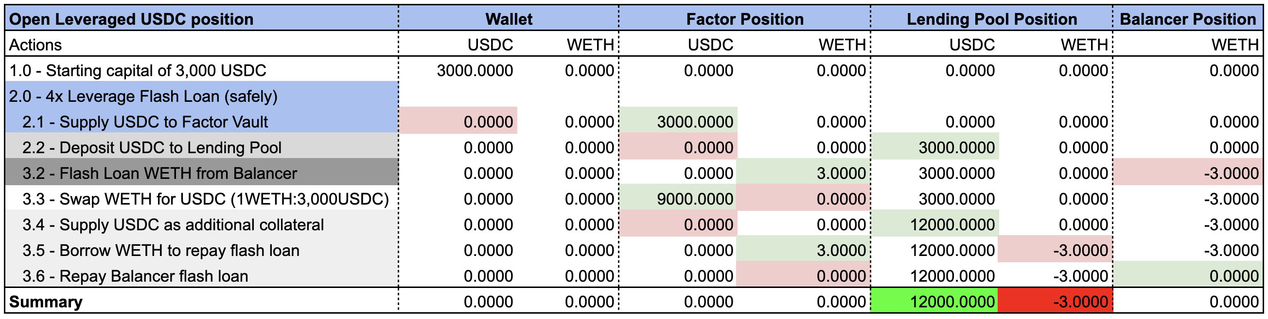 Note that the flash loaned value is added to the position's collateral as <mark style="color:green;">asset</mark> token while the position incurs interest payments on the <mark style="color:red;">debt</mark> token equalling the flash loaned value.&#x20;