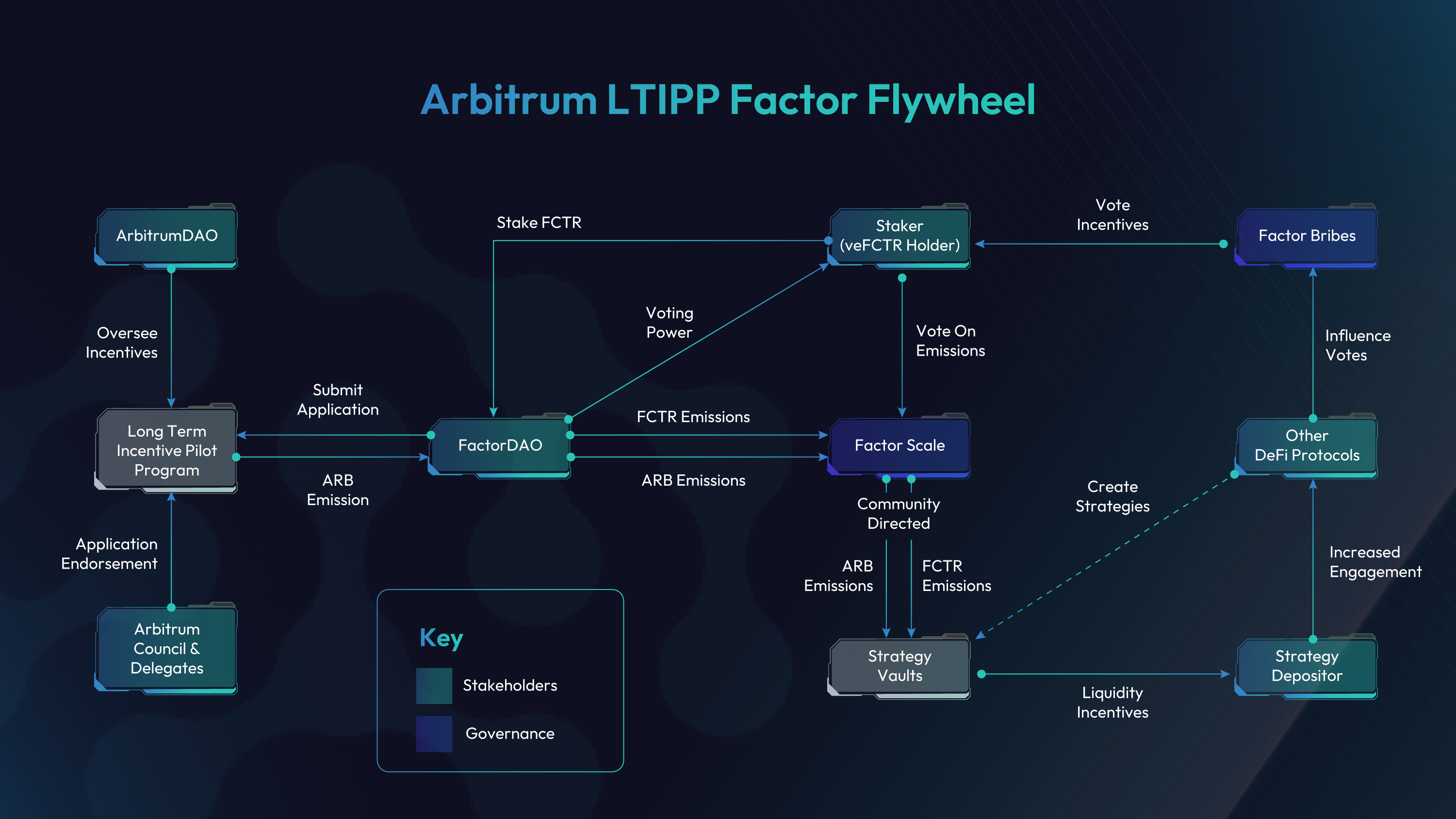 To ensure the most democratized use of ArbitrumDAO funds, LTIPP ARB will be distributed to various Factor strategy vaults based on the proportion of votes allocated by FCTR stakers. By staking FCTR on the FactorDAO, users become eligible to vote on the distribution of protocol emissions (via Factor Scale) which includes the LTIPP ARB for the duration of the LTIPP program. A FCTR staker's voting power is directly correlated to their staked duration as well as protocol liquidity contributions thereby incentivizing votes with a longer term focus.