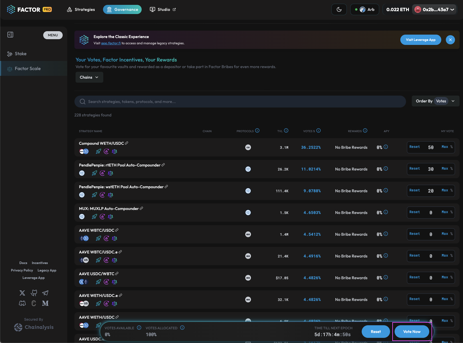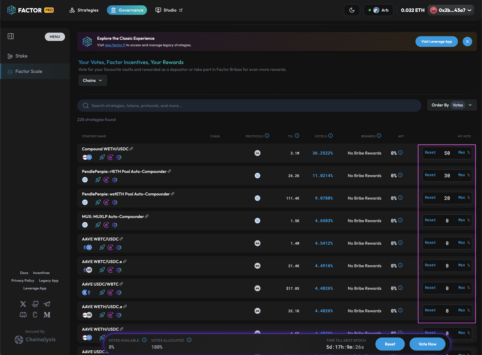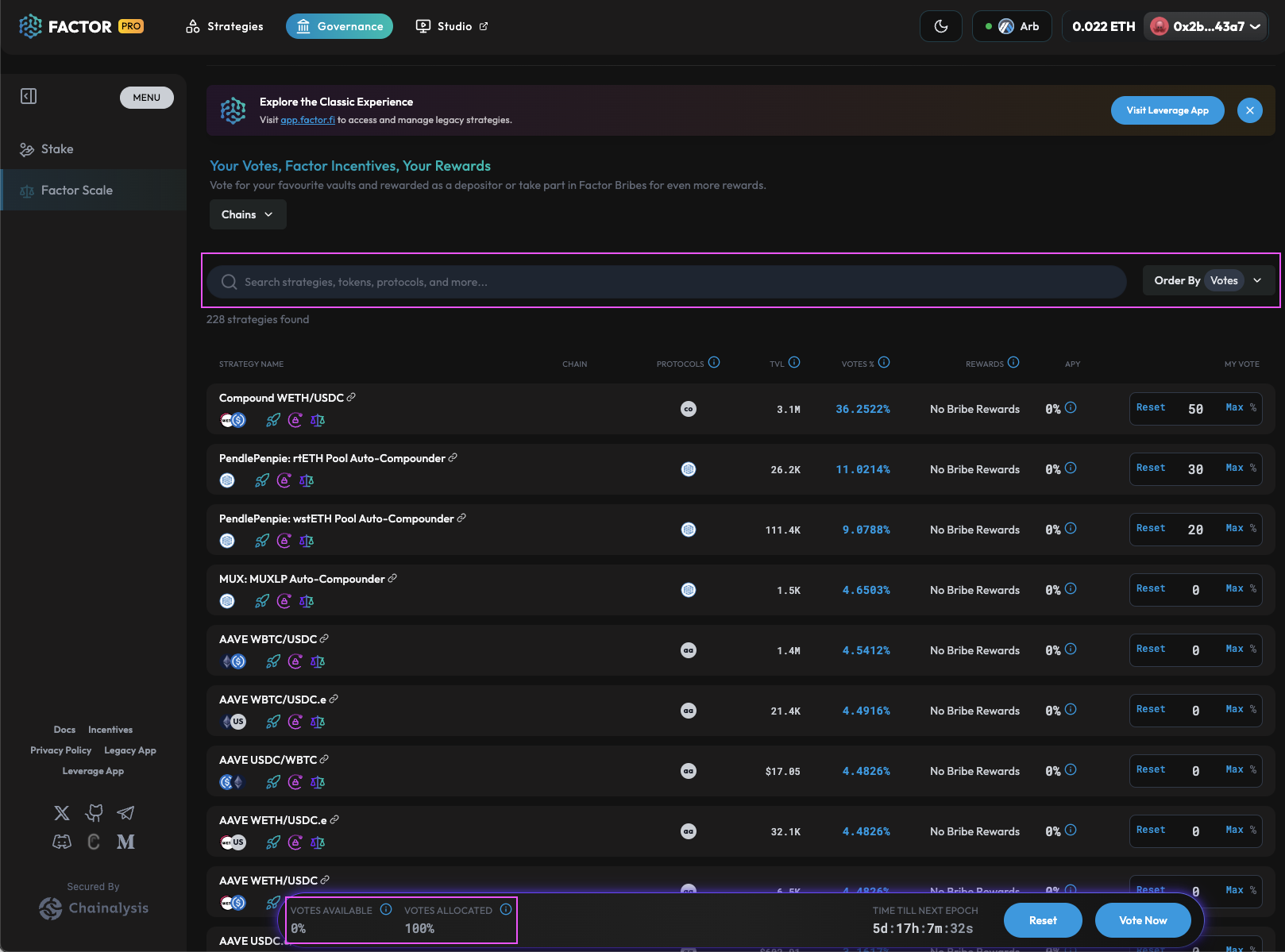 Factor Scale enables you to search for your favourite [curated vaults](https://docs.factor.fi/governance/factor-scale#overview) and allocate a percentage of your total voting power towards. You will also be able to see your total voting power, vote allocations,  as well as any unallocated votes.